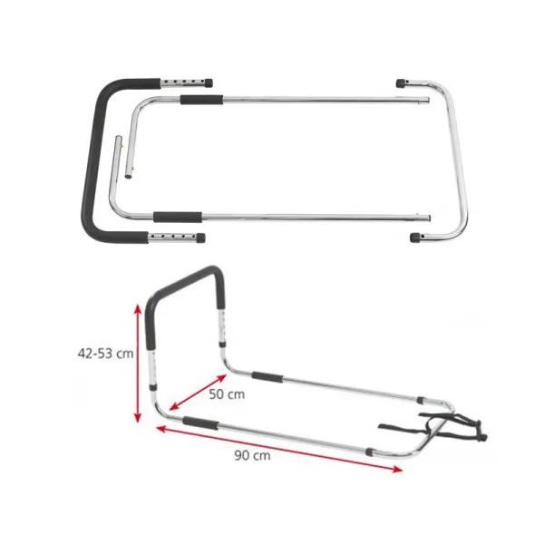 Por otra parte, su altura es ajustable entre 42 y 53 cm, permitiendo adaptarse a las necesidades específicas de cada usuario. Incluye también una correa de sujeción que asegura la barandilla firmemente al somier, situándose de manera segura debajo del colchón.