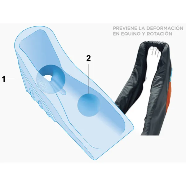 La forma anatómica de la bota ayuda a prevenir la deformación en equino y la rotación, protegiendo zonas de alto riesgo como el tendón de Aquiles.