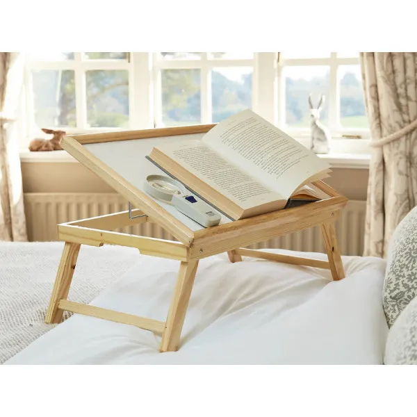 La Mesita para cama NANI se destaca por su estructura robusta y su funcionalidad adaptable. Se inclina en cinco ángulos diferentes, lo que permite al usuario encontrar la posición más cómoda para sus actividades. Incluso, las patas se pliegan bajo la bandeja, permitiendo que la mesa se pose sobre el regazo del usuario sin restringir el movimiento, un diseño pensado para maximizar el confort.